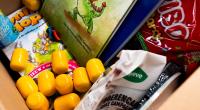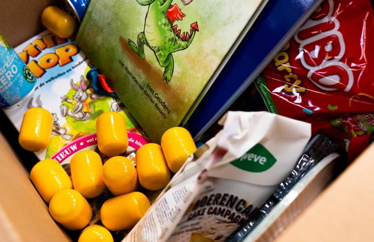 Doos van 'Feestvarken vzw' die ingepakt wordt