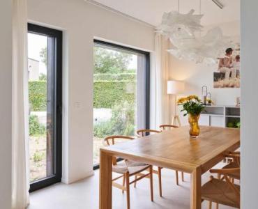Dankzij de grote ramen baadt deze eetruimte de hele dag in natuurlijk licht. Het slanke zwarte raamprofiel voegt een modern accent toe, maar blijft subtiel genoeg om het uitzicht en de lichtinval niet te verstoren. Hierdoor komt het buitenzicht volop tot zijn recht en ontstaat een sfeervol lichtspel. Het resultaat is een warme, uitnodigende plek waar het gezellig tafelen is.