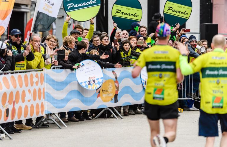 De eerste loper van elk team legt 40 kilometer af, de volgende 30, de voorlaatste 20 en de laatste 10. Er loopt dus om de tien kilometer een extra persoon mee in het team met frisse energie, wat de andere lopers alleen maar kan aanmoedigen. Zodra ze als team over de finishlijn komen, zullen ze 100 km hebben afgelegd. Samen bereiken we meer dan alleen – of het nu gaat over lopen of over strijden tegen kanker.
