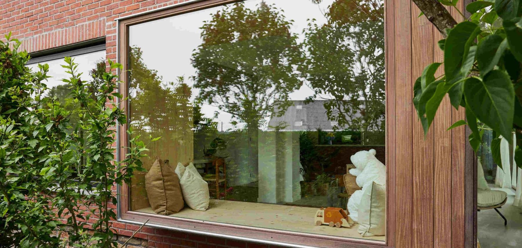 Dit raam is niet alleen een blikvanger van buitenaf, maar ook een gezellige zithoek binnenin. Het vormt een knusse cocon met uitzicht op de tuin: perfect om te lezen, spelen of gewoon te chillen. De houten afwerking versterkt de natuurlijke sfeer en maakt van deze plek een echte favoriet in huis.