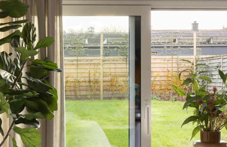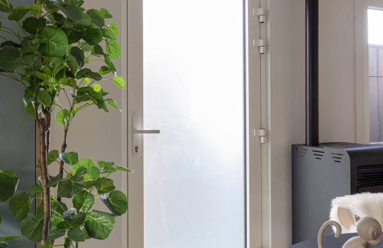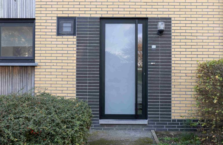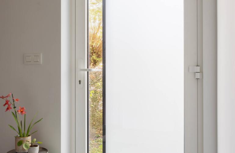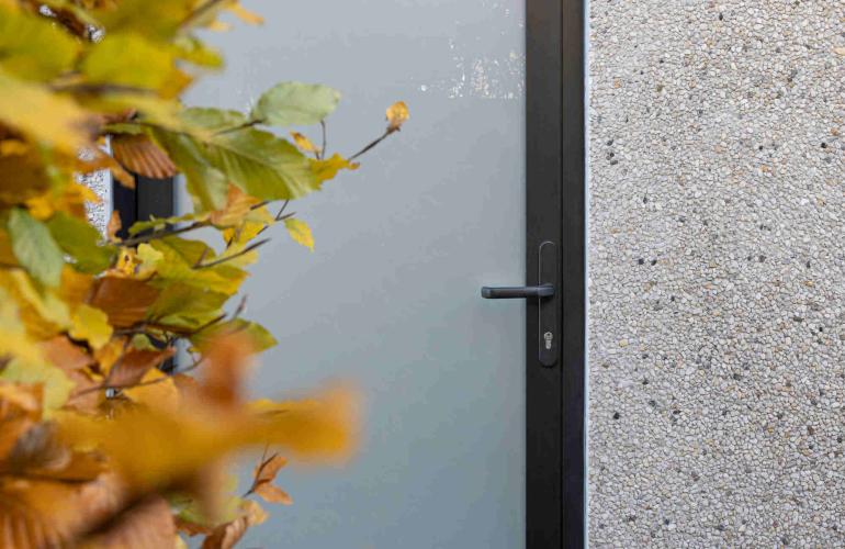 De voordeur en zijdeur zijn afgewerkt met gezandstraald glas en zorgen voor een mooie lichtinval én de gewenste privacy.