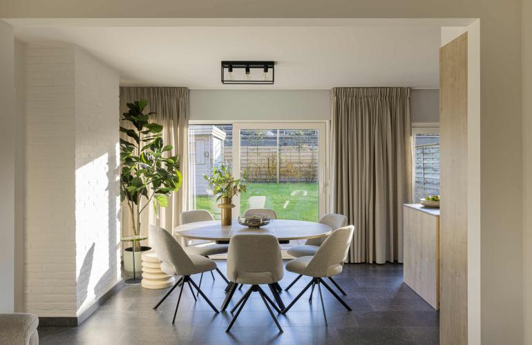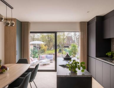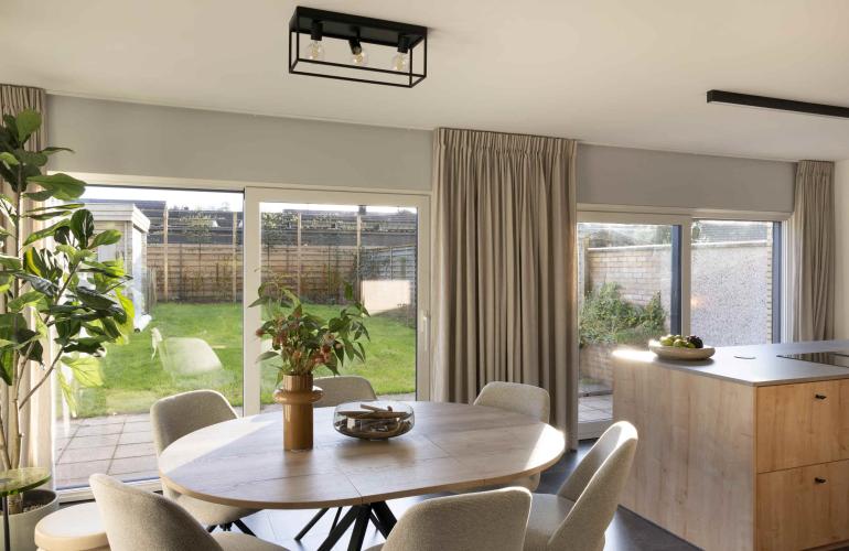 Voor het 'Ons huis/nieuw huis'-project (seizoen 2) in Diksmuide plaatste KwadrO Jabbeke bij Bieke en Dries twee royale monorail schuiframen en twee aluminium deuren in elegant zwart. Dankzij het grote glasoppervlak stroomt het daglicht rijkelijk naar binnen.