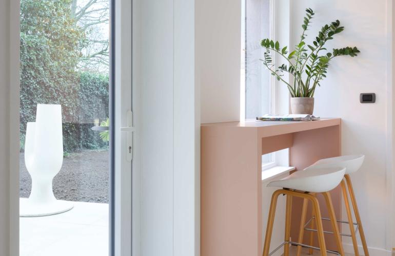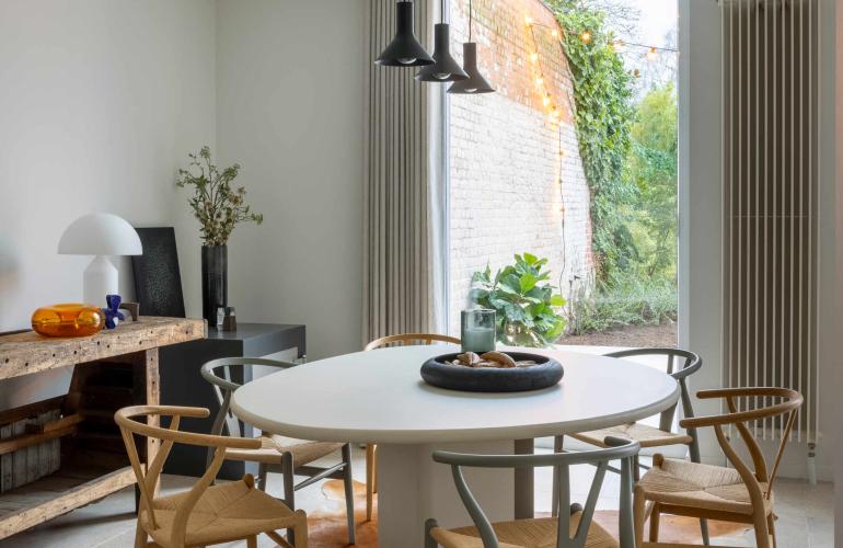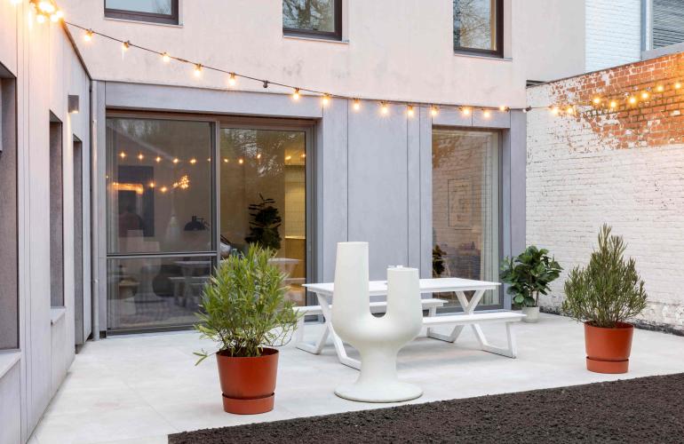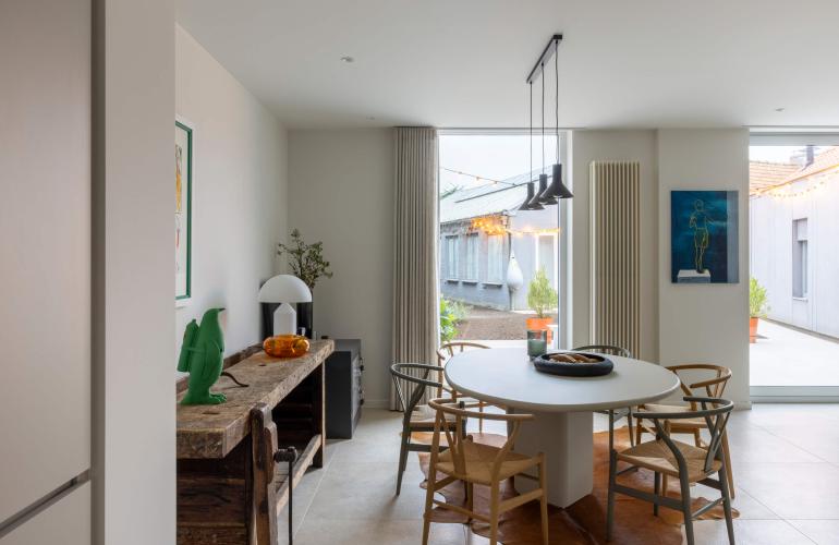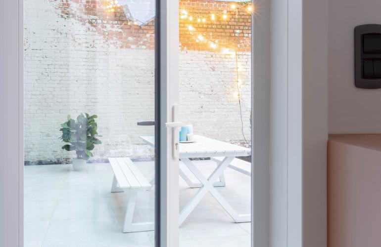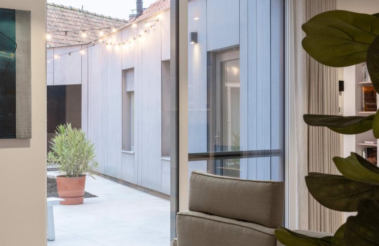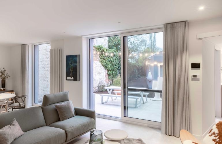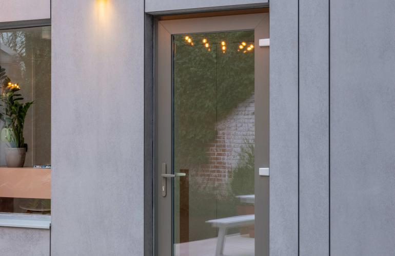 Voor het 'Ons huis/nieuw huis'-project in Wingene werden de raamopeningen vergroot tot op de grond, en plaatste KwadrO bij Pieter en Maxim een groot elegant aluminium schuifraam, in combinatie met een pvc-deur en een groot vast raam zonder verdelingen. Dankzij deze keuze geniet de woning van een maximale lichtinval en een vlotte connectie met de tuin.