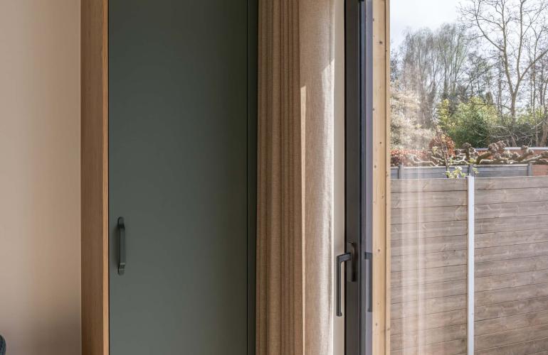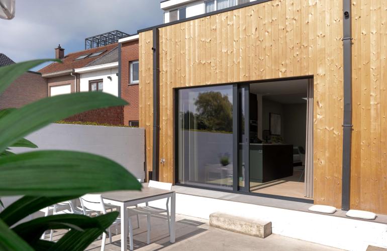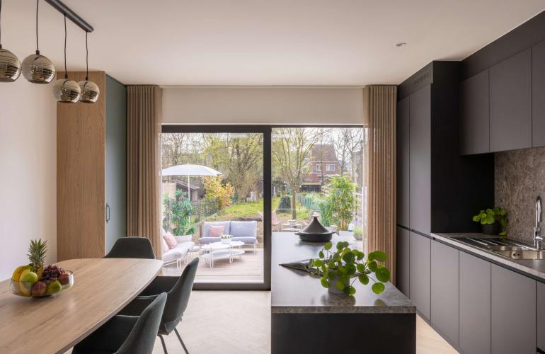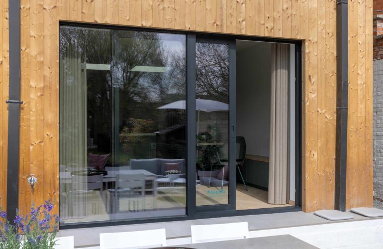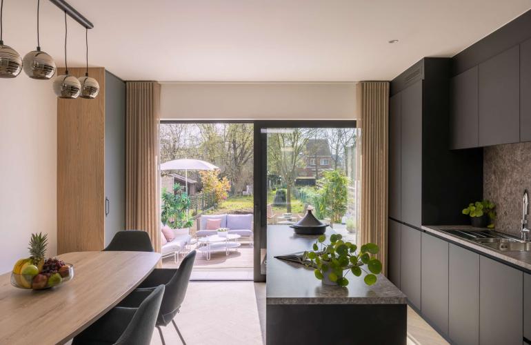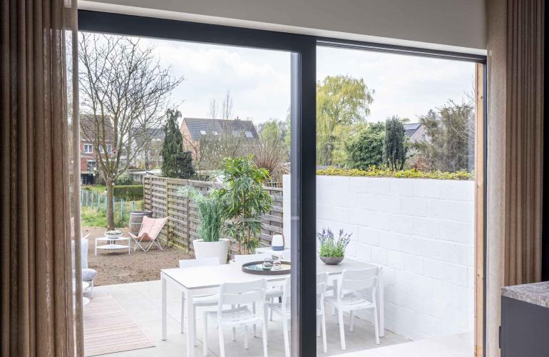 Voor het tv-programma Ons Huis, Nieuw Huis plaatste KwadrO bij Veerle en Teun in Mechelen een aluminium monorail schuifraam. Dankzij de verzonken plaatsing oogt het geheel niet alleen strak en modern, maar is het ook bijzonder praktisch. Het schuifraam versterkt het gevoel van een echte leefkeuken, met meer connectie tussen binnen en buiten.